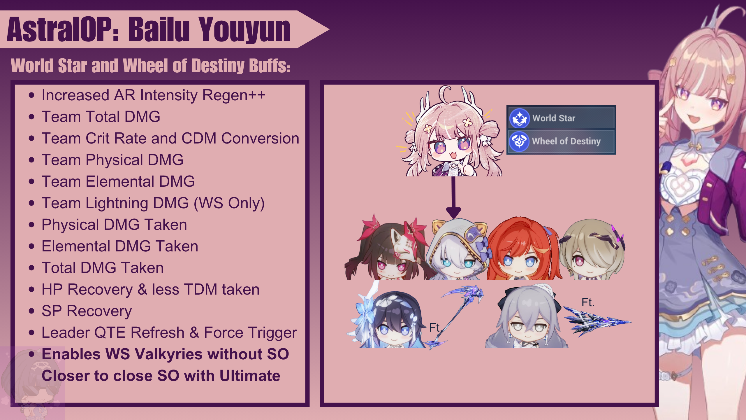 Youyun supports World Star and Wheel of Destiny to some extent. Her buffs are often tied with