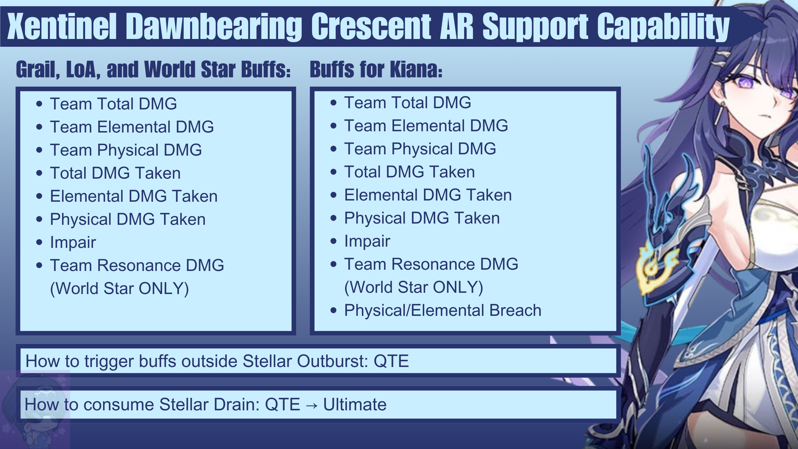 Xentinel Dawnbearing Crescent (XDC) can support 3 AR Specializations. She’s fast in consuming , but early tests show she’s not too good in supporting AR Elemental valkyries. The only exception is Ba-Dum Kiana (FWS), where XDC can be FWS’ breach support.