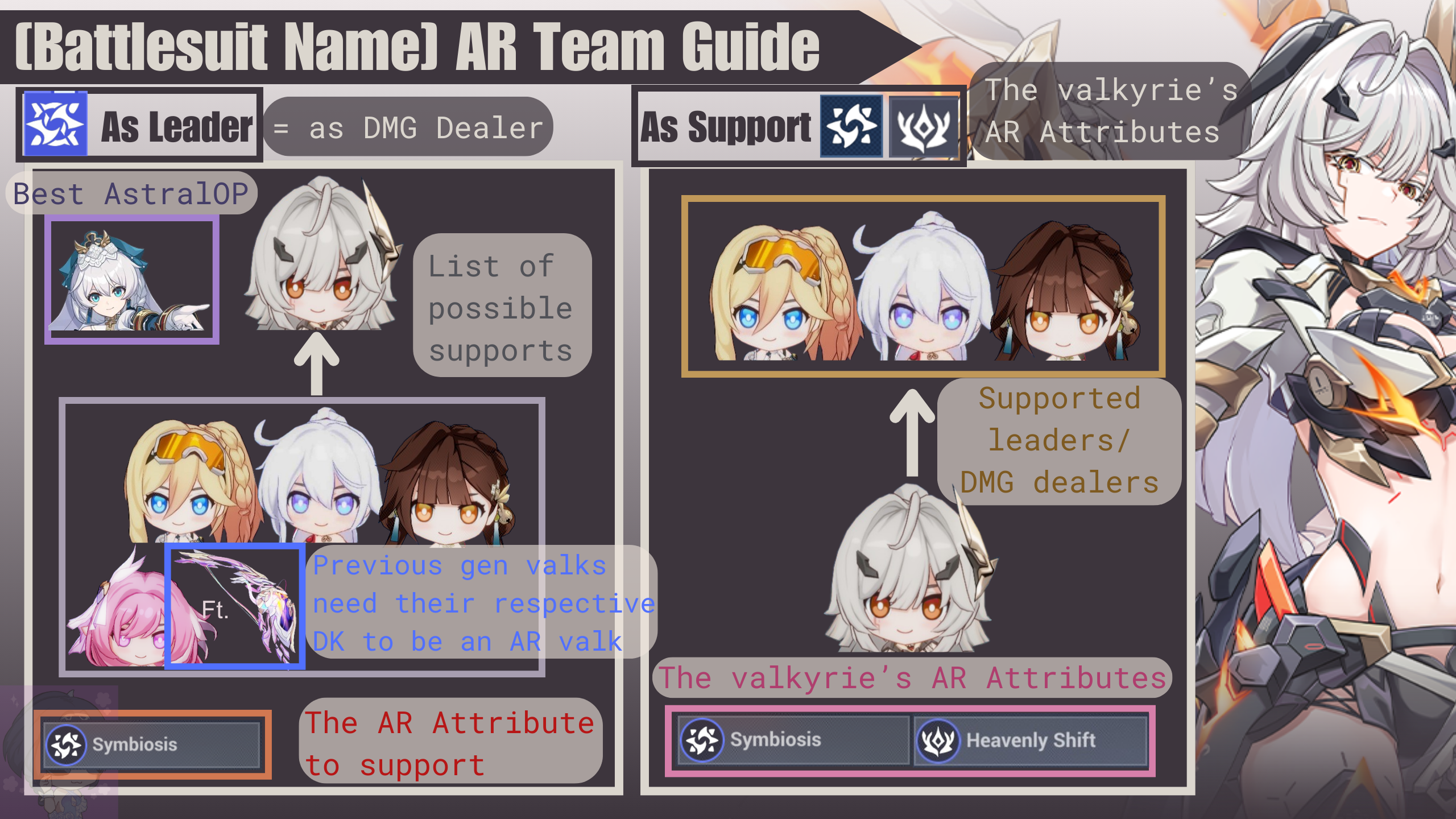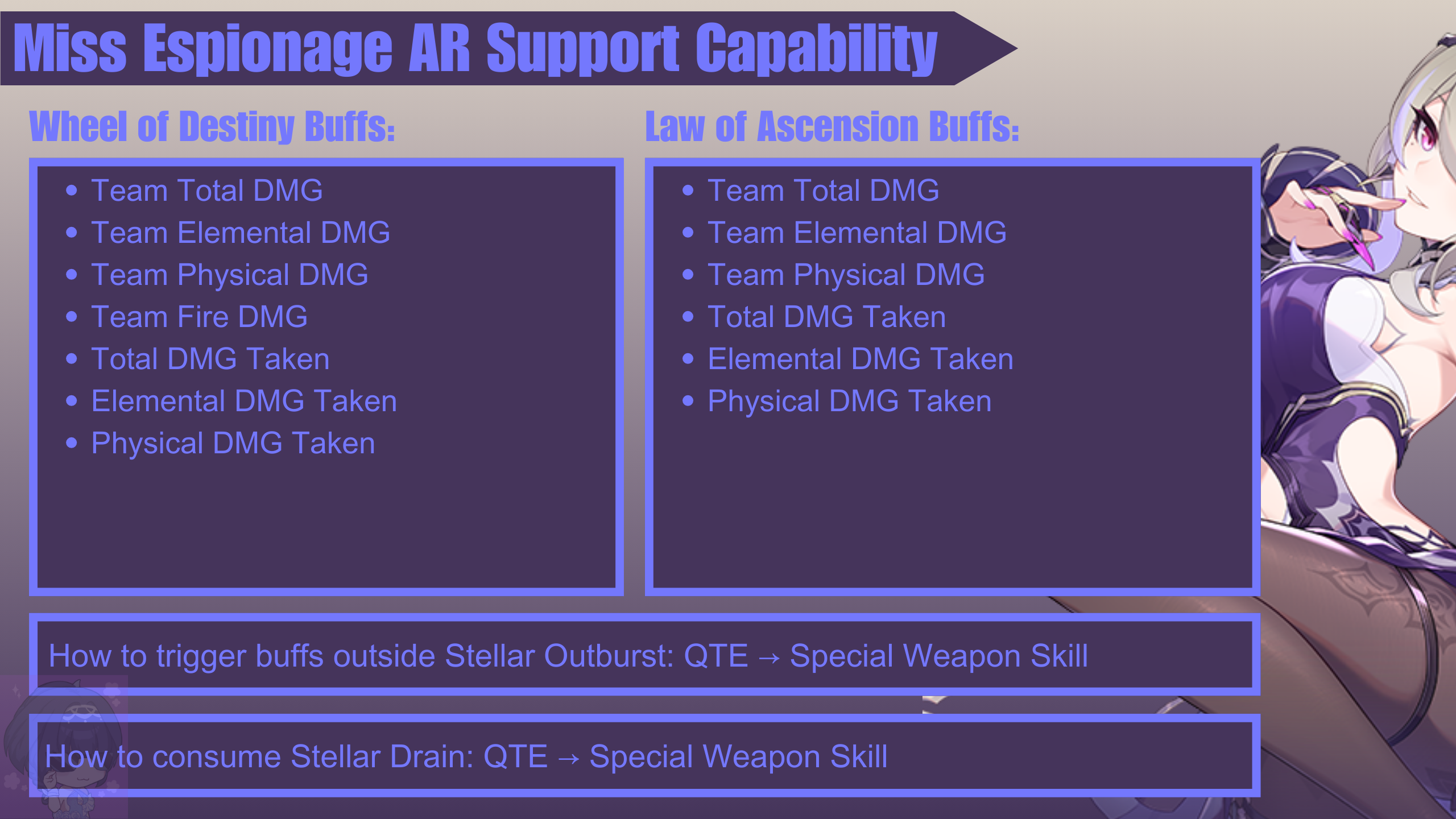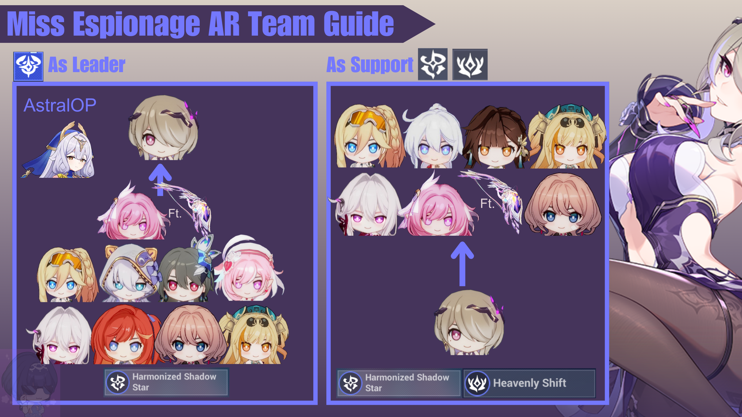 Miss Espionage (ME) is a valkyrie, so she has to be supported by AR valkyries with Harmonized Shadow Star trait, otherwise her potentials aren’t fully unlocked. However, using Rite of Oblivion valkyries CAN work until you get Harmonized Shadow Star valkyries, as they provide general buffs.