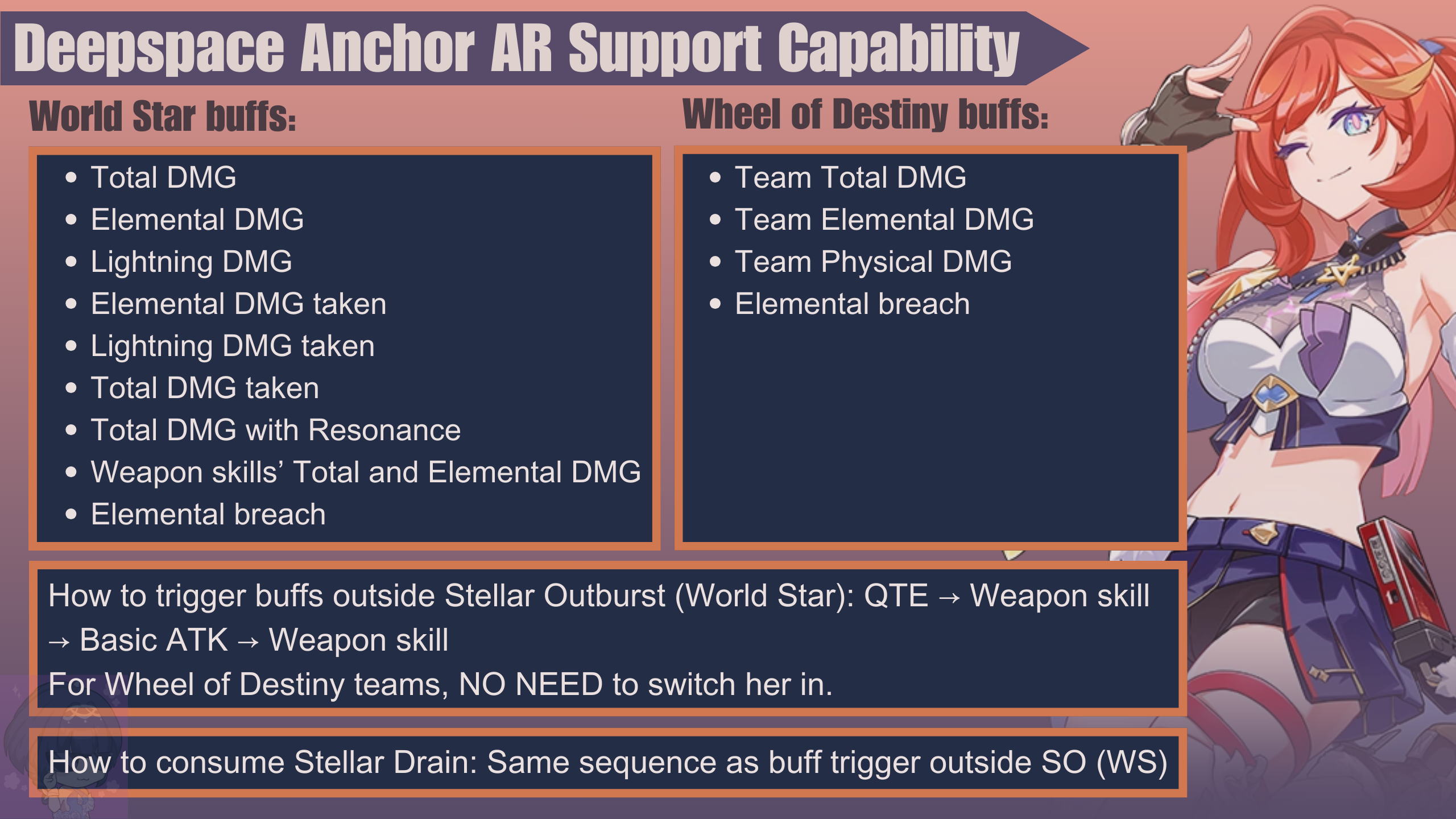 Deepspace Anchor: First Light (DA) has quite complex rotation or combo sequences both as DPS and as World Star support, as her combo sequences involve multiple buttons consequently. However, in Wheel of Destiny teams, DA doesn’t need to enter field often to provide buffs.