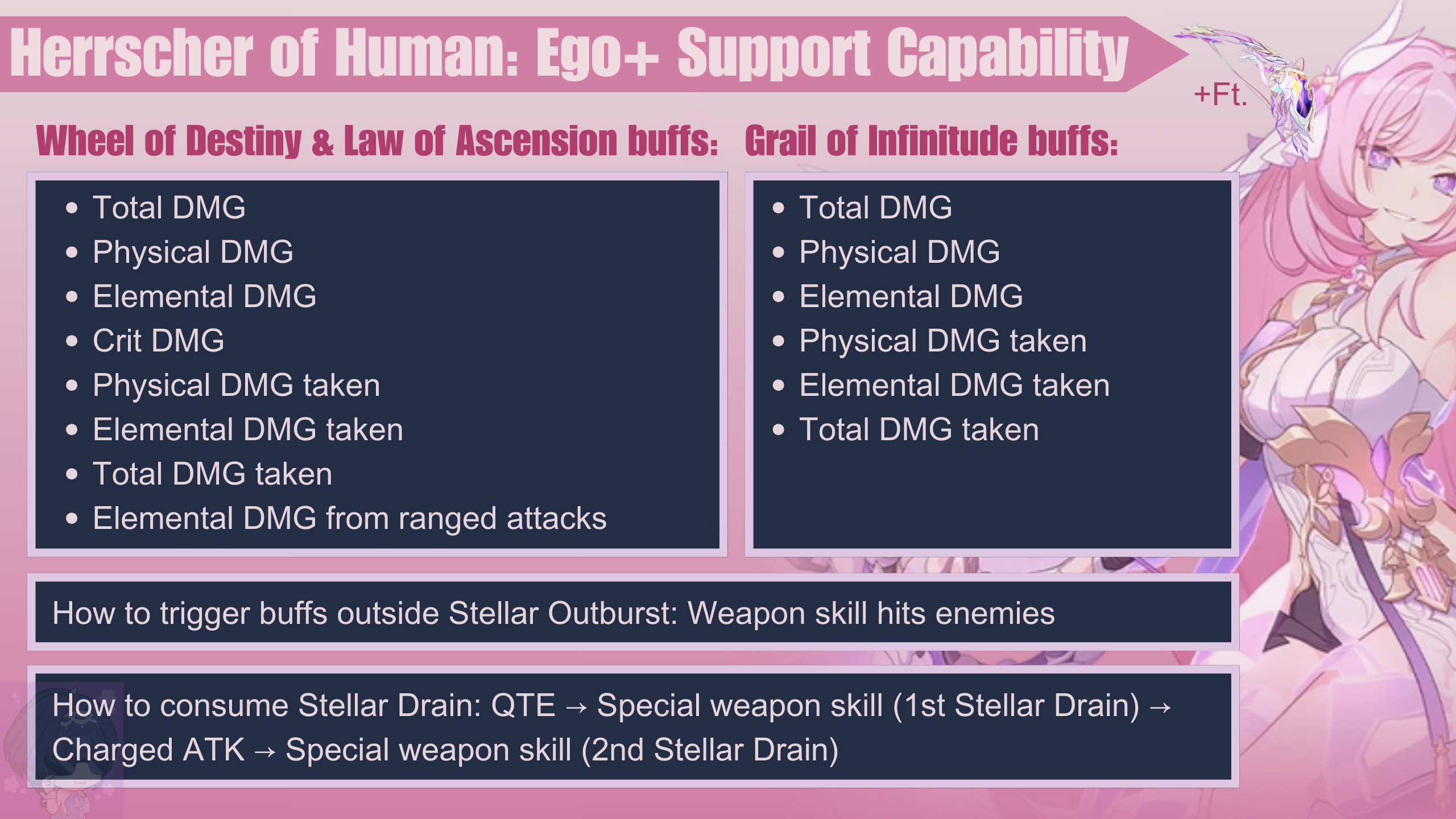 Herrscher of Human Ego (HoHE) is a ranged DPS with two forms. The basic form, Herrscher of Human form, utilizes bow and a combination of hold ATK and special weapon skill to aim. Activating burst or Stellar Outburst will make HoHE enters Herrscher of Origin form, which utilizes her manta ray (NOT counted as summoned entity). As support, she can apply quick buffs and consume Stellar Drain fast.
