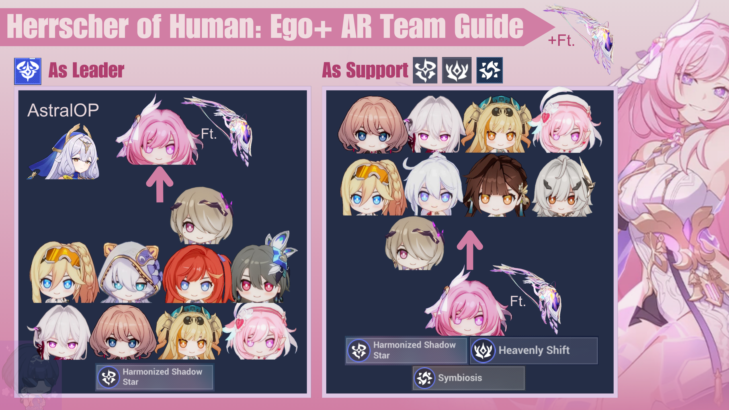 Herrscher of Human Ego (HoHE) is a valkyrie, so she has to be supported by AR valkyries with Harmonized Shadow Star trait, otherwise her potentials aren’t fully unlocked. However, using Rite of Oblivion valkyries CAN work until you get Harmonized Shadow Star valkyries, as they provide general buffs.