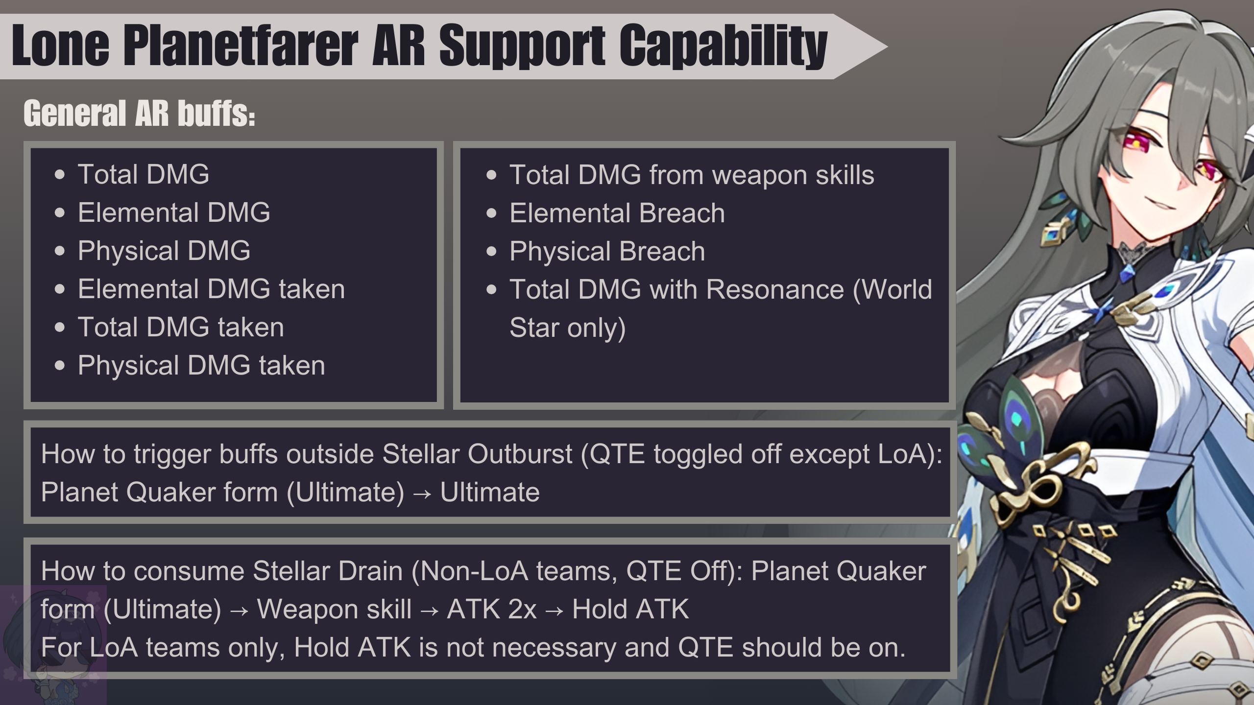 Lone Planetfarer (LP) can provide , making her one of the core supports that are needed more often than not. In addition, her AR Intensity regen is one of the highest of all Astral Ring system valkyries. However, LP is notorious for very slow in consuming .