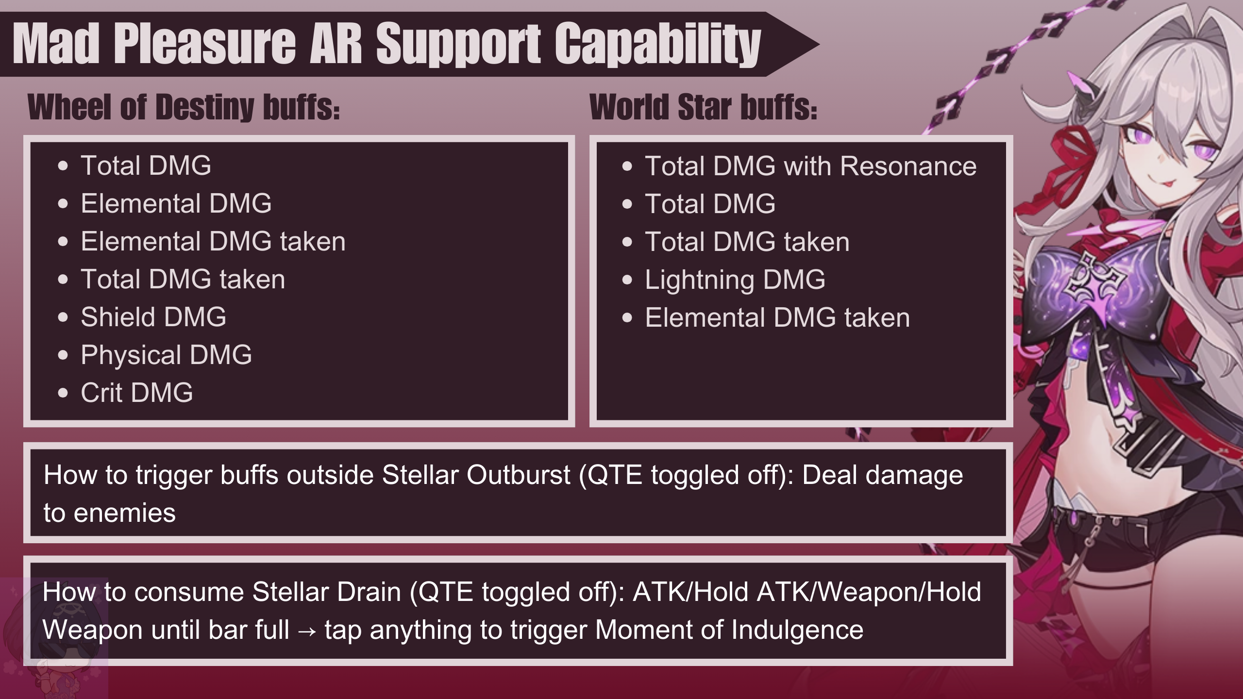 Mad Pleasure: Shadowbringer (MPS) can apply buffs relatively quickly, doesn’t need QTE to apply them, and can start the battle. Consuming is a long process for MPS, though, unless she can hit enemies with ultimate which temporarily stops time.