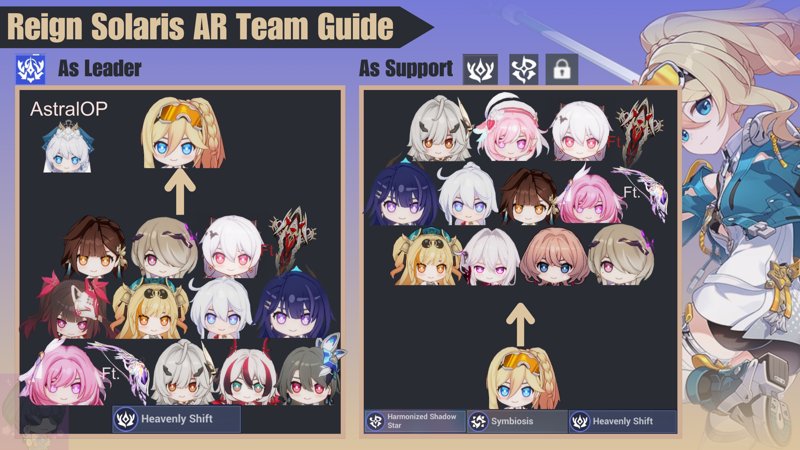 Reign Solaris (RS) is a valkyrie, so she has to be supported by AR valkyries with Heavenly Shift trait, otherwise her potentials aren’t fully unlocked. However, using Rite of Oblivion valkyries CAN work until you get Heavenly Shift valkyries, as they provide general buffs.