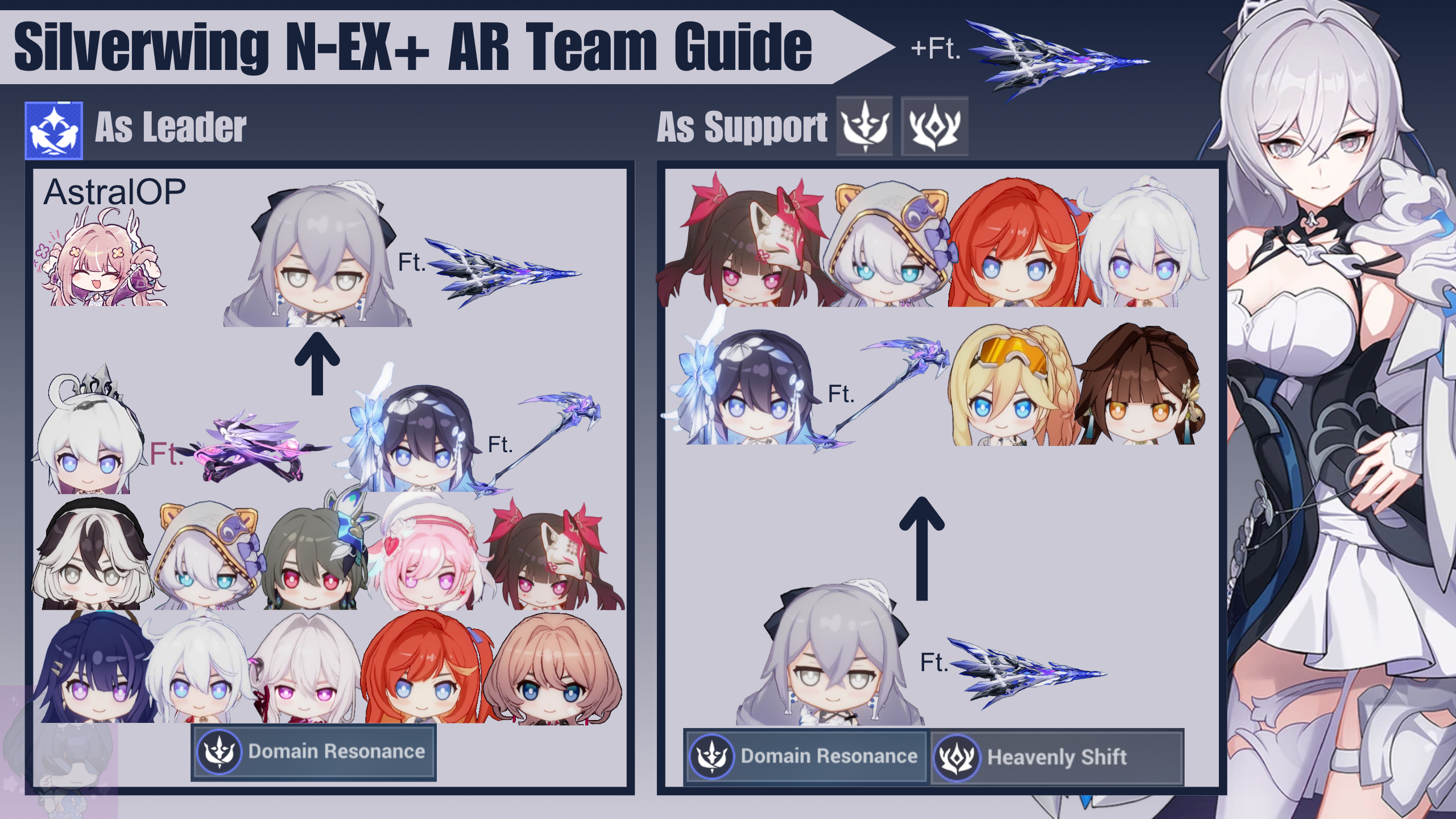 Silverwing N-EX is a valkyrie, so she has to be supported by AR valkyries with Domain Resonance trait, otherwise her potentials aren’t fully unlocked. However, using Rite of Oblivion valkyries CAN work until you get Domain Resonance valkyries, as they provide general buffs.