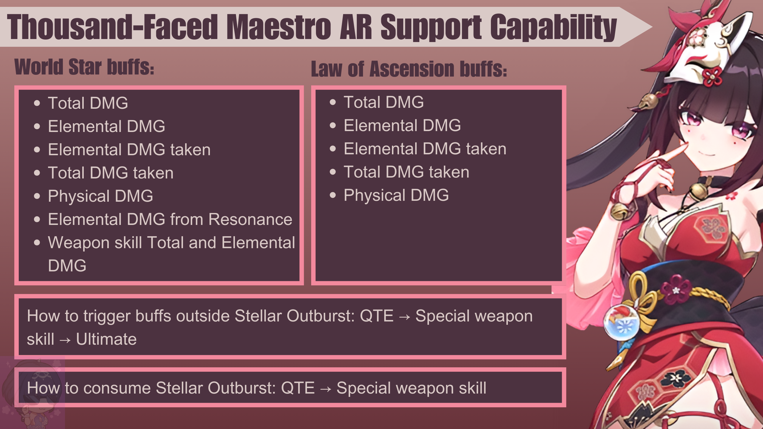 Thousand-Faced Maestro: Cameo! (TFM) is especially good at supporting Quantum AR valkyrie (Theresa SI), since she’s able to delete 2 Quantum shields at once. She is also a decent Law of Ascension support and quick to apply buffs. Her special weapon skill also partly stops time, enabling her to consume quickly.