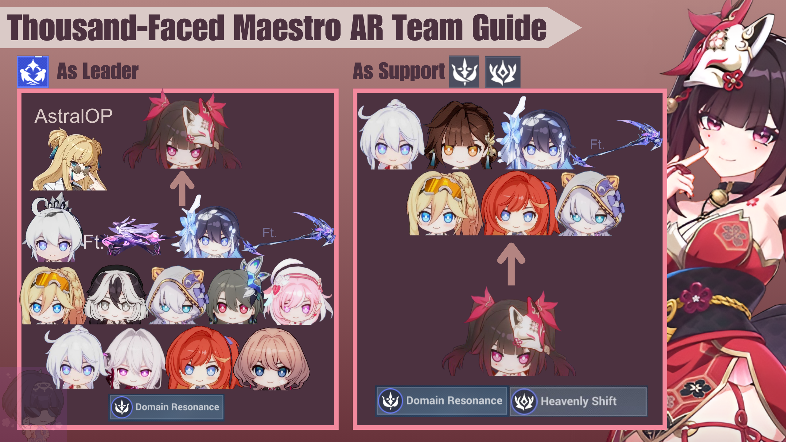 Thousand-Faced Maestro: Cameo! (TFM) is a valkyrie, so she has to be supported by AR valkyries with Domain Resonance trait, otherwise her potentials aren’t fully unlocked. However, using Rite of Oblivion valkyries CAN work until you get Domain Resonance valkyries, as they provide general buffs.